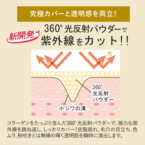 という4大奇跡を起こす、コラーゲンをたっぷり含んだ新開発“360°光反射パウダー処方”のファンデーションです。